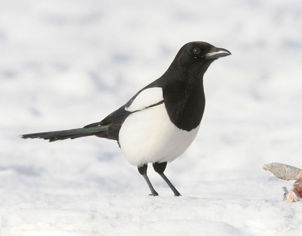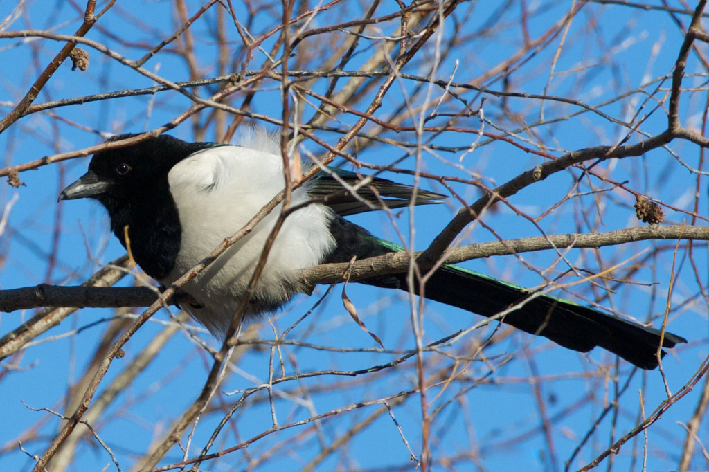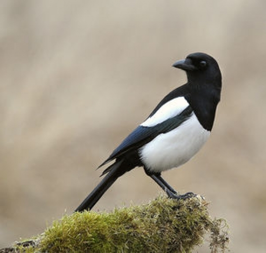 The magpies can easily be identified thanks to their morphology and their black and white plumage. It has a black plumage on the top of the body, head and chest and white on the belly, flanks and base of the wings. The black plumage shows an iridescence of feathers. The beak is black as are the legs.